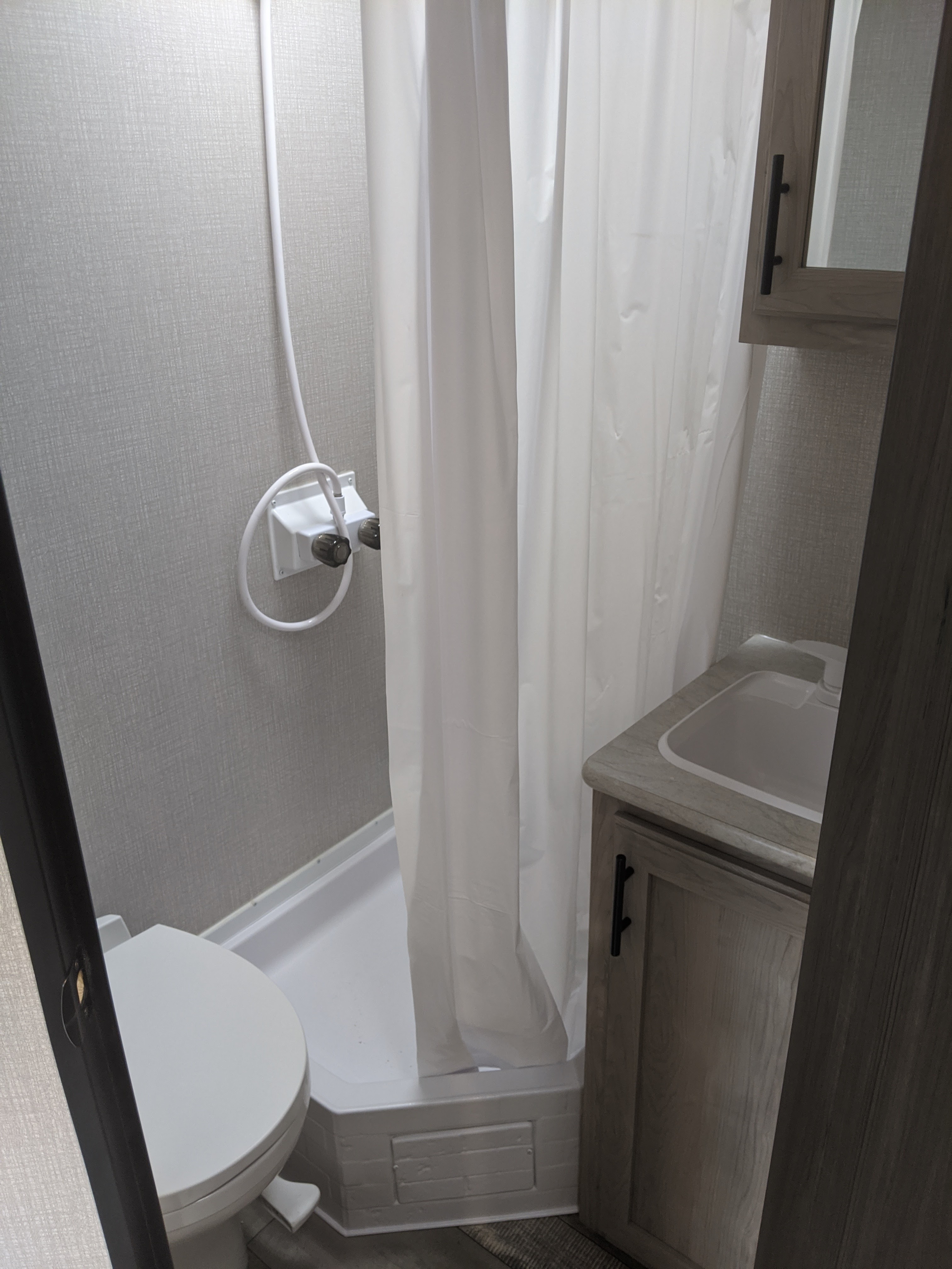 A bathroom! Our pop up didnt have a bathroom so this is super exciting for us! We will probably only use the shower to clean off Charlottes dirty feet since she loves running around the campground with no shoes on!