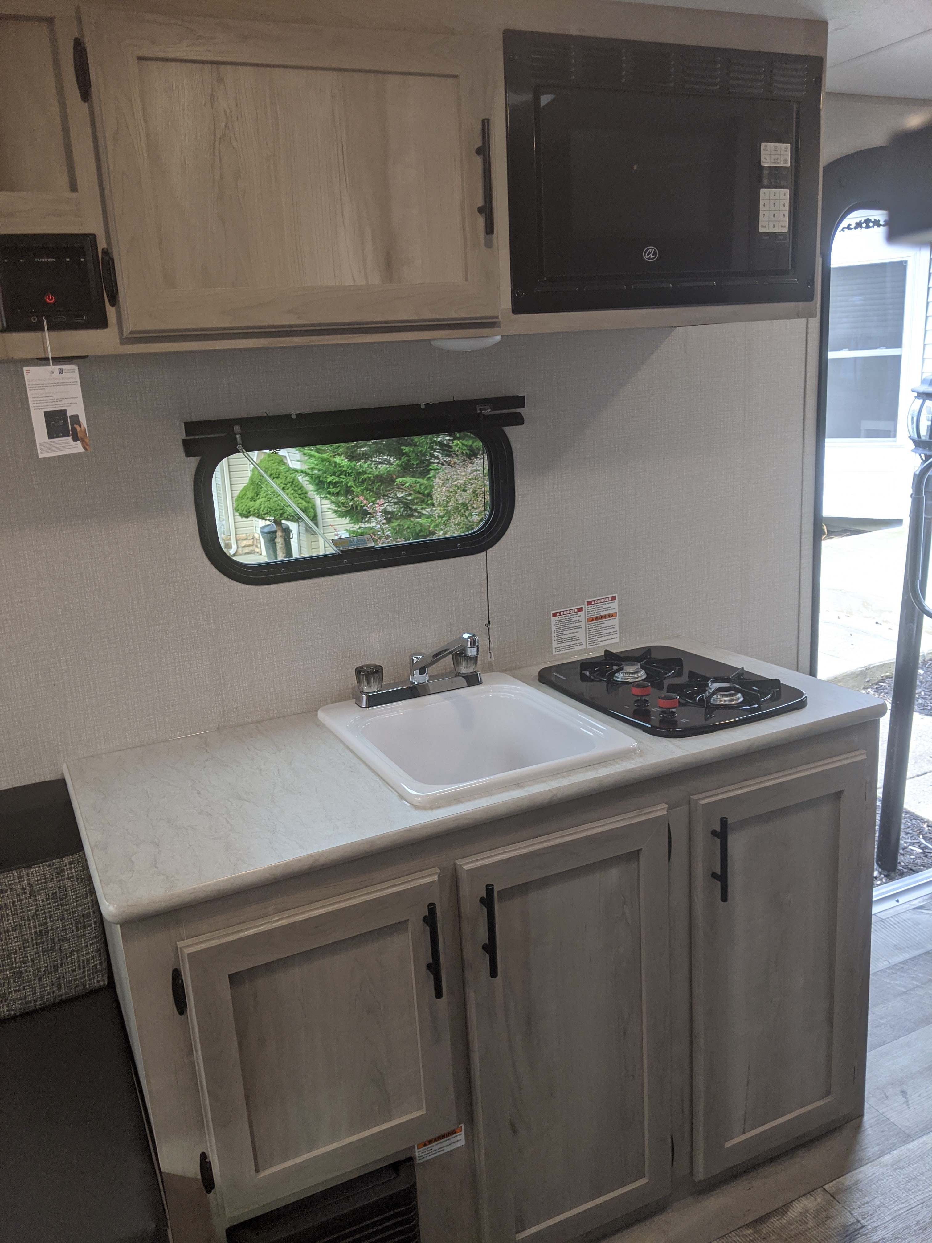 We love that it has bluetooth speakers that also work on the outside, some outside storage for things like our water and sewer connection and a one push awning to keep us dry on those rainy days.