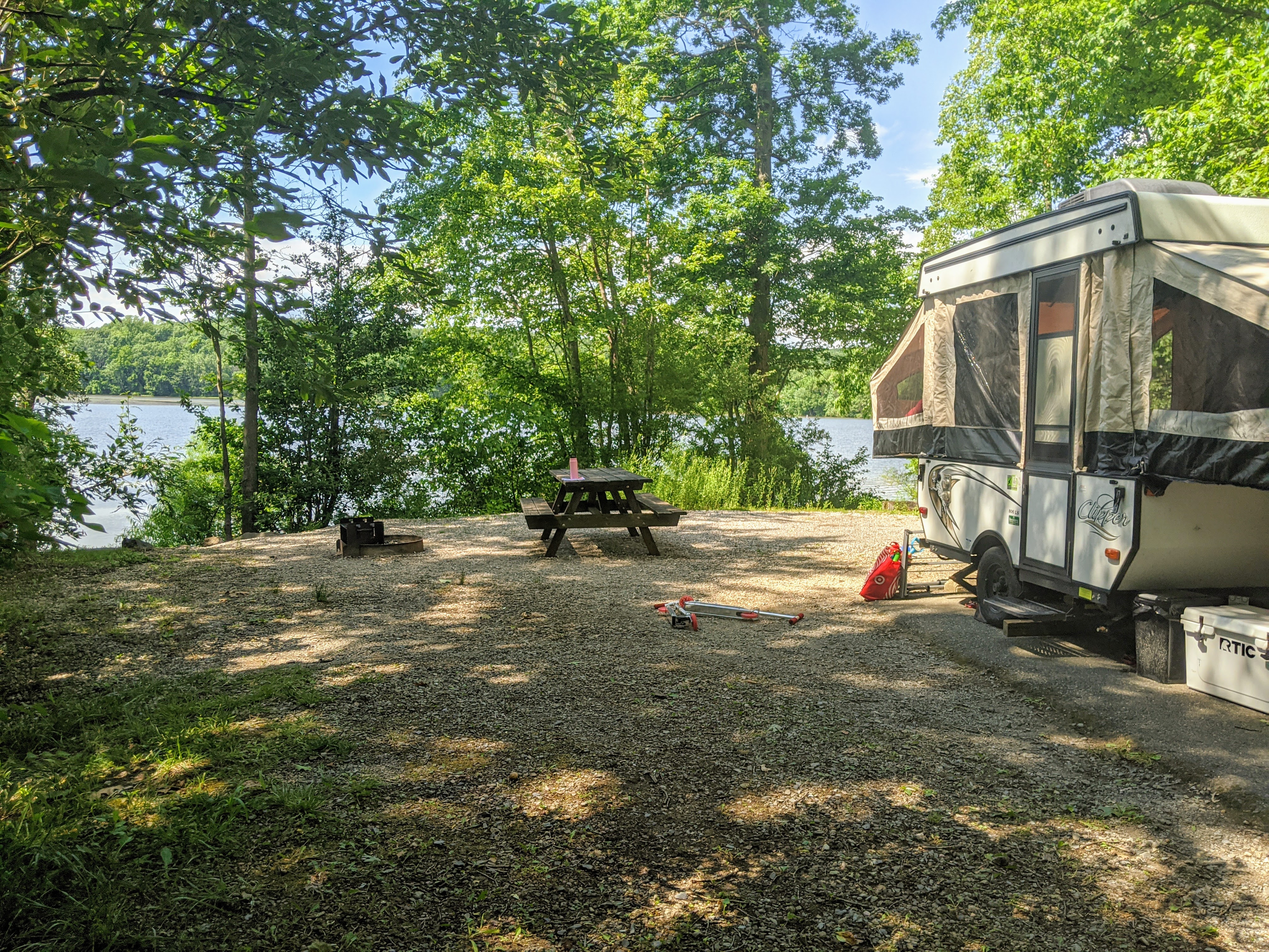 Gifford Pinchot State Park Campground is located in Lewisberry, PA. We visited for the first time this summer and loved it to much we went back again! The rates are very low (around $30/night) because its a state park campground. There are no full hook up sites, but some sites do have electricity. Unfortunately, none of the waterfront sites have electricity. We wanted to stay right on the water so we choose site 114 right next to the swimming beach. It was a great spot!
