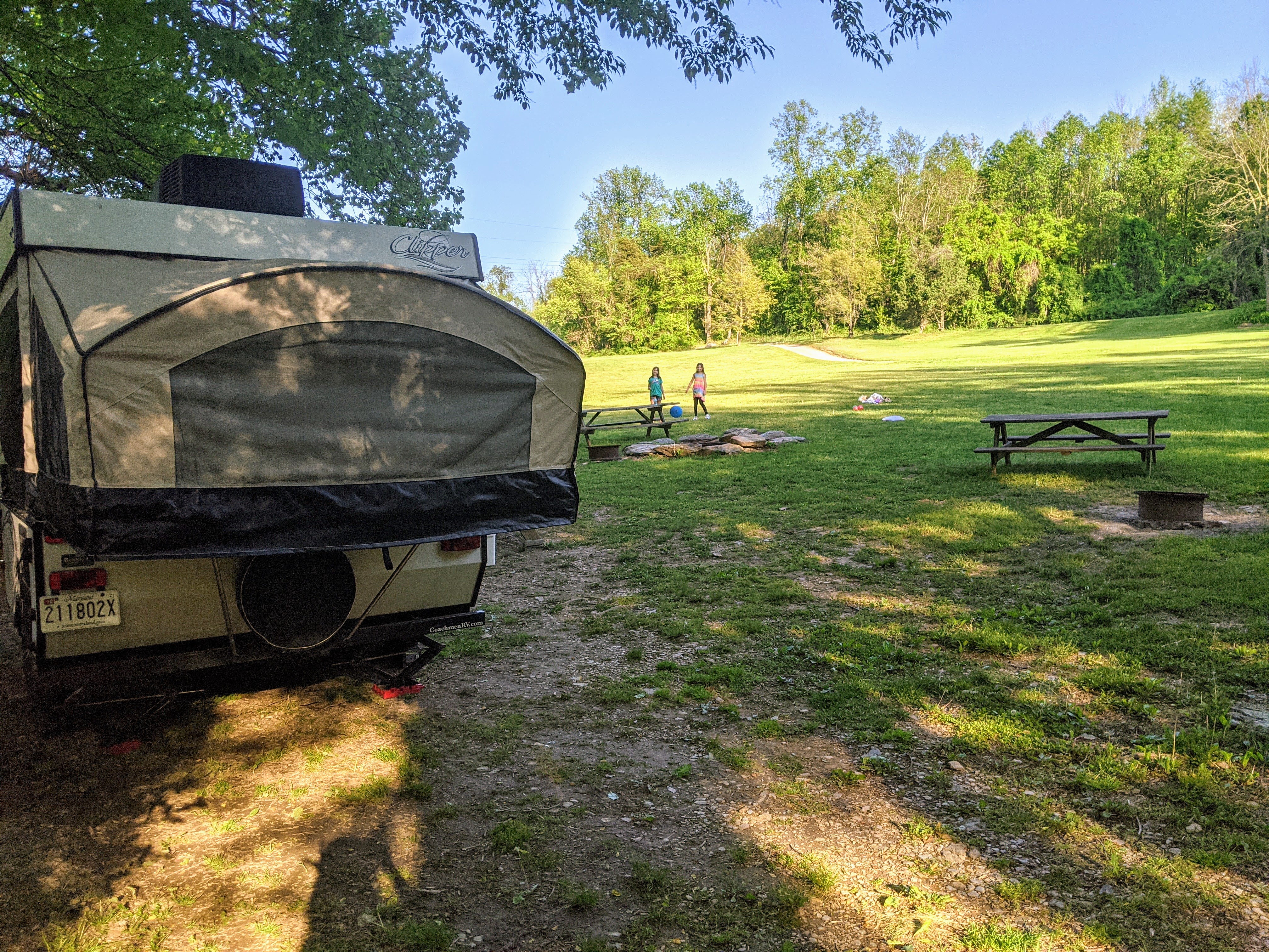 Tucquan Park Family Campground is a family campground in Holtwood, PA. It was one of the first campgrounds we visited after the COVID outbreak started. We were site 68 B, which was one of the nicest and most confusing sites in the campground. The site was huge, right near a bathroom and with a giant field for the kids to run around.