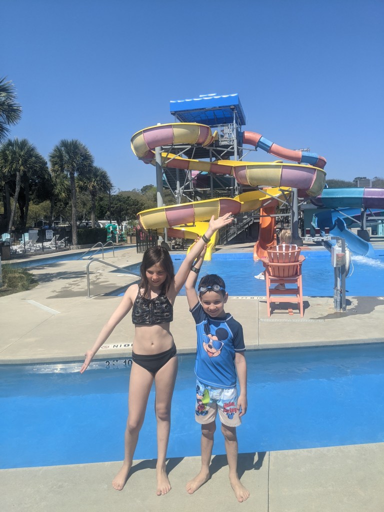 Over Easter break, we decided to make the trip south to Myrtle Beach in search of the ocean and sunshine. After some research, we selected Lakewood Camping Resort. The campground is located on the beach, just a few miles south of the main area of Myrtle Beach. An important thing to note about this campground is it is huge! Literally thousands of sites. When you book, you choose the area you wish to be in. We choose beach block one, and were assigned to site 1205. I really loved this area of the campground, as it was close to the beach and waterpark, but still had a good amount of trees and was quiet. We were also right next to the parking lot for the waterpark so had no neighbors on one side which was nice for some extra privacy. We also loved the price of this campground, $59/night for oceanblock which included all amenities.