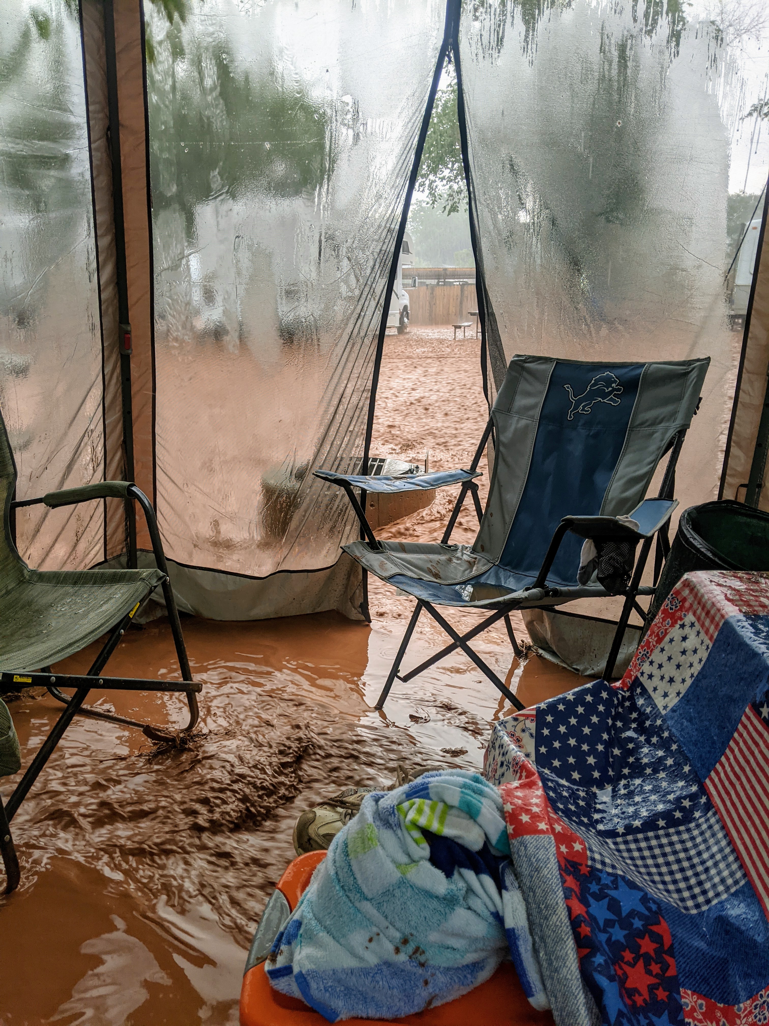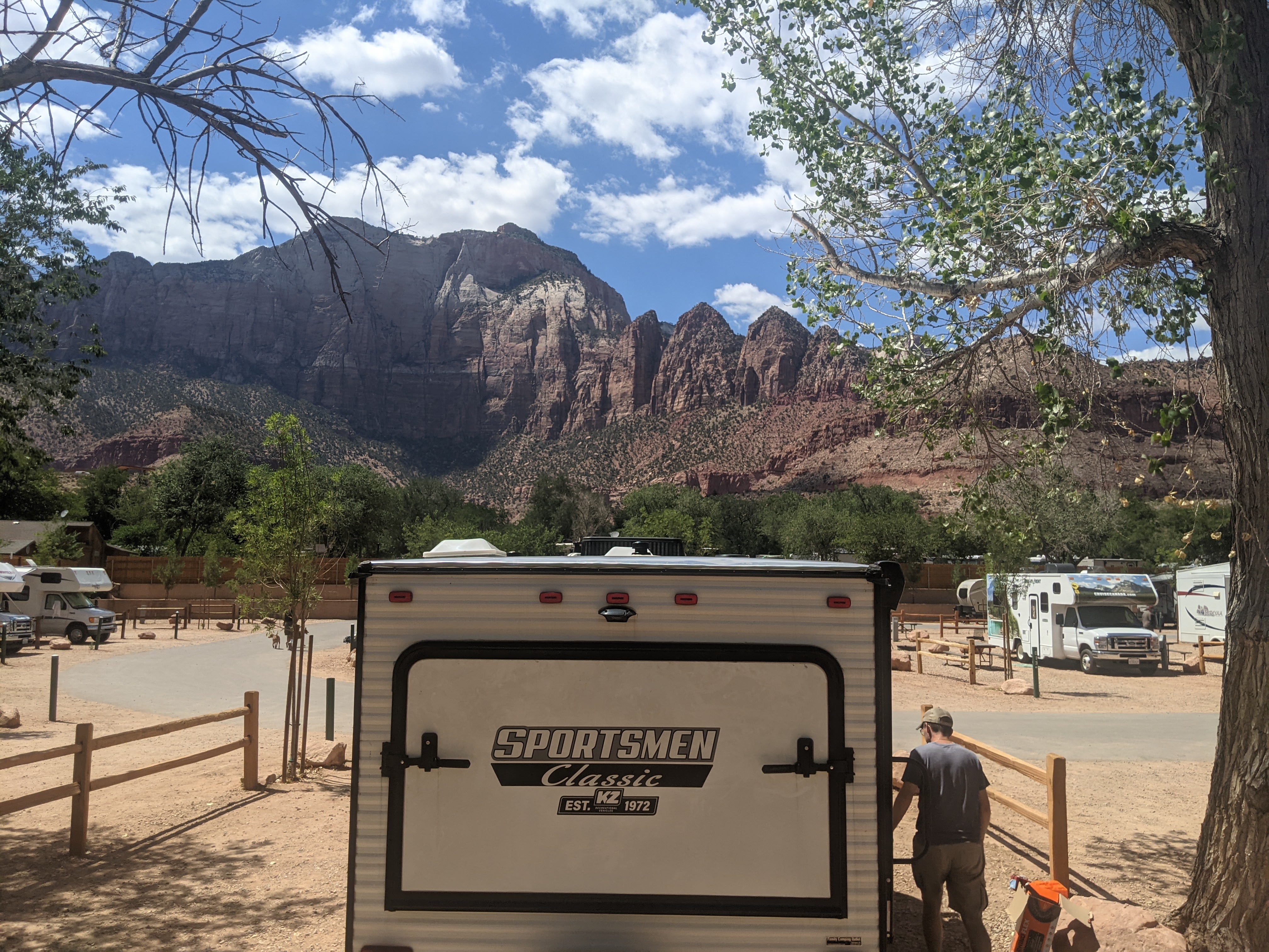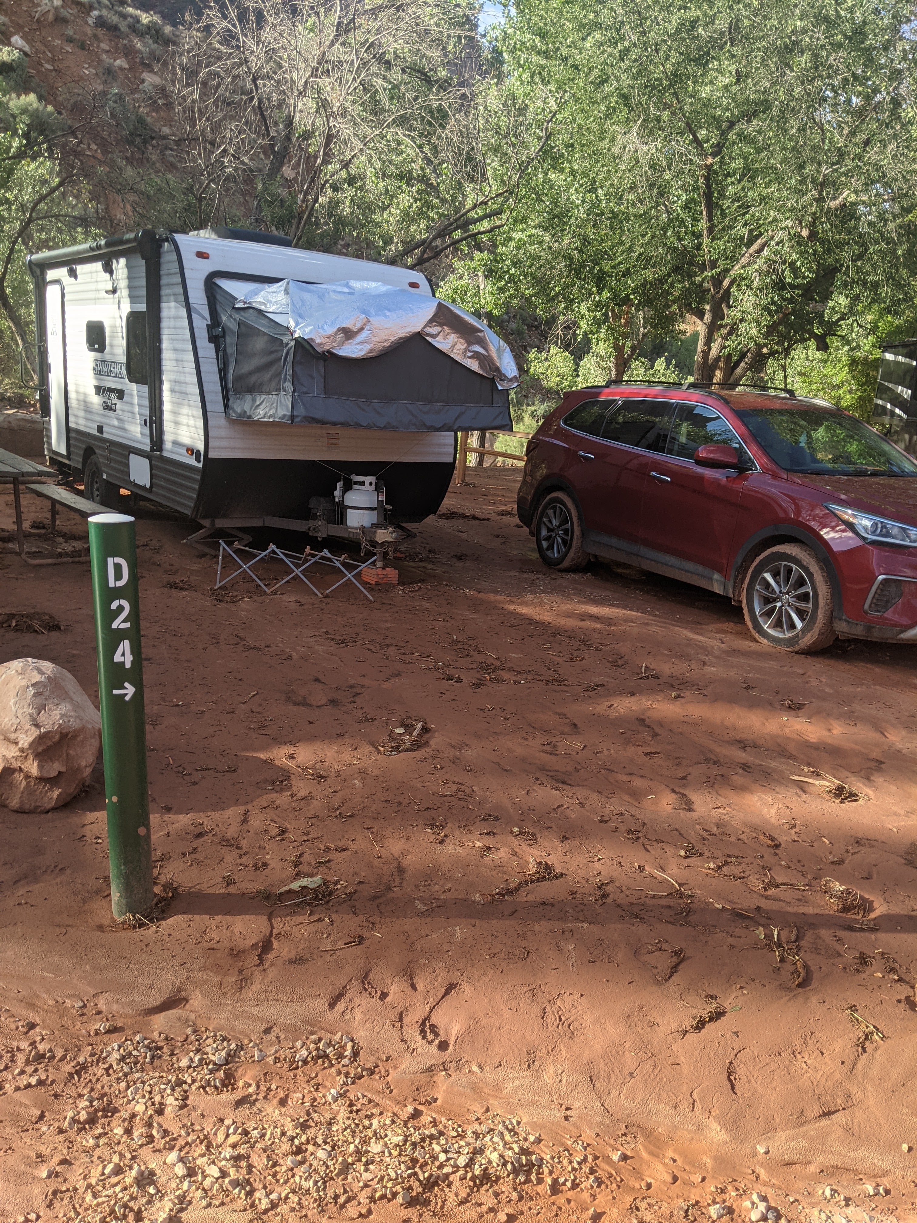 Not everything goes to plan on vacation. The afternoon after we hiked Angels Landing, a huge flash flood came through. It destroyed parts of the campground (pool, laundry room, front office) and covered everything in a think layer of red mud. Honestly we were very lucky, cars went into each other, some of the tent campers lost everything to the river and the worst thing that happened to us was a broken drying rack and a lost wheel chock. As we watched the river rise behind our site I was very nervous the camper would move.