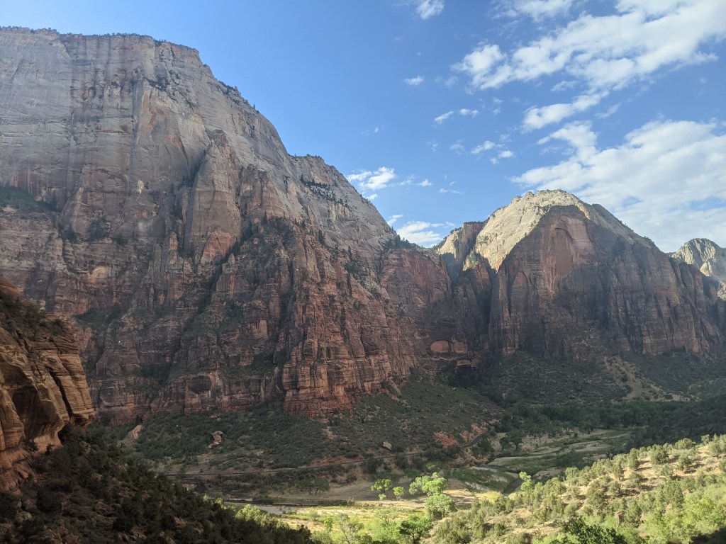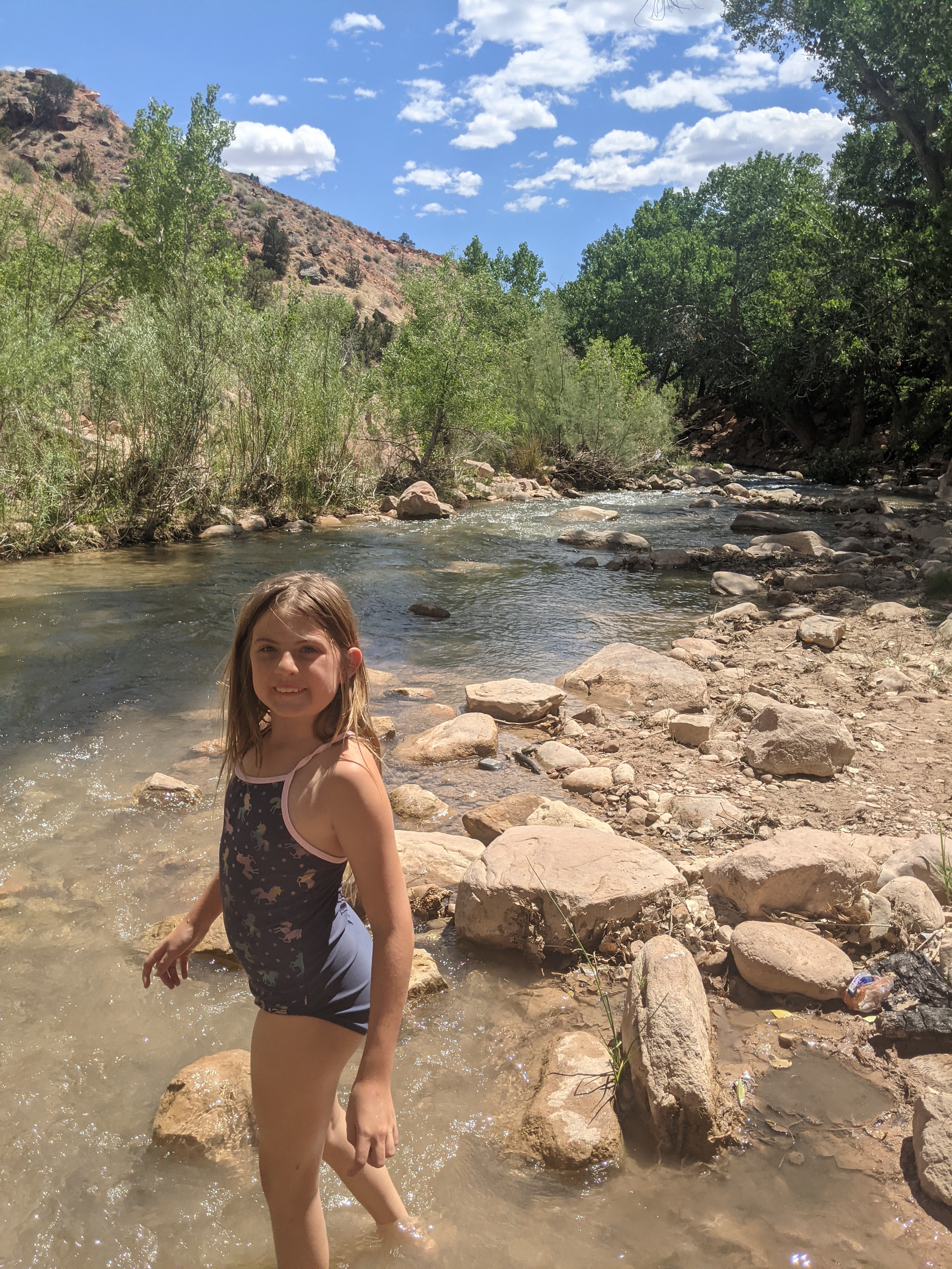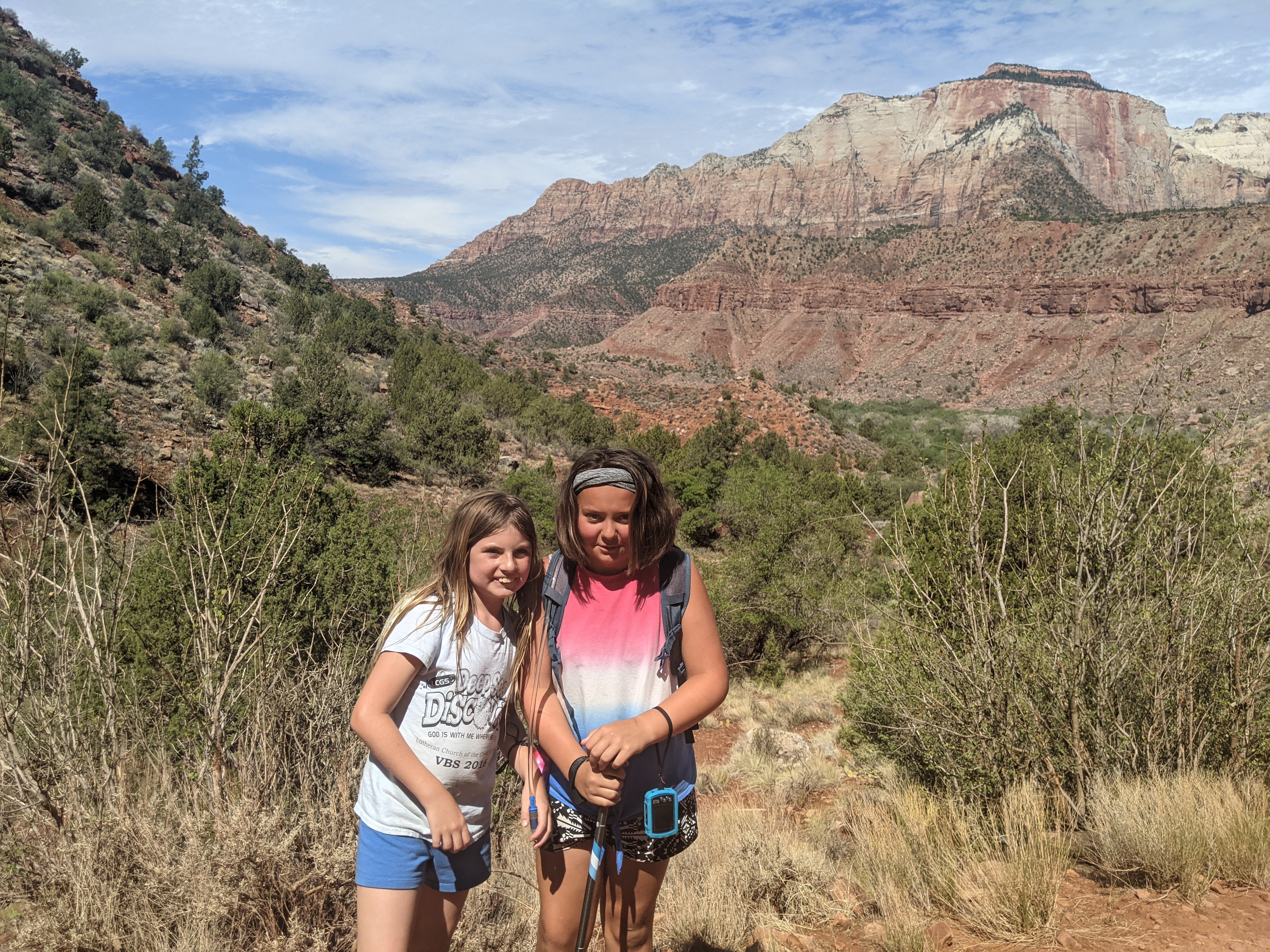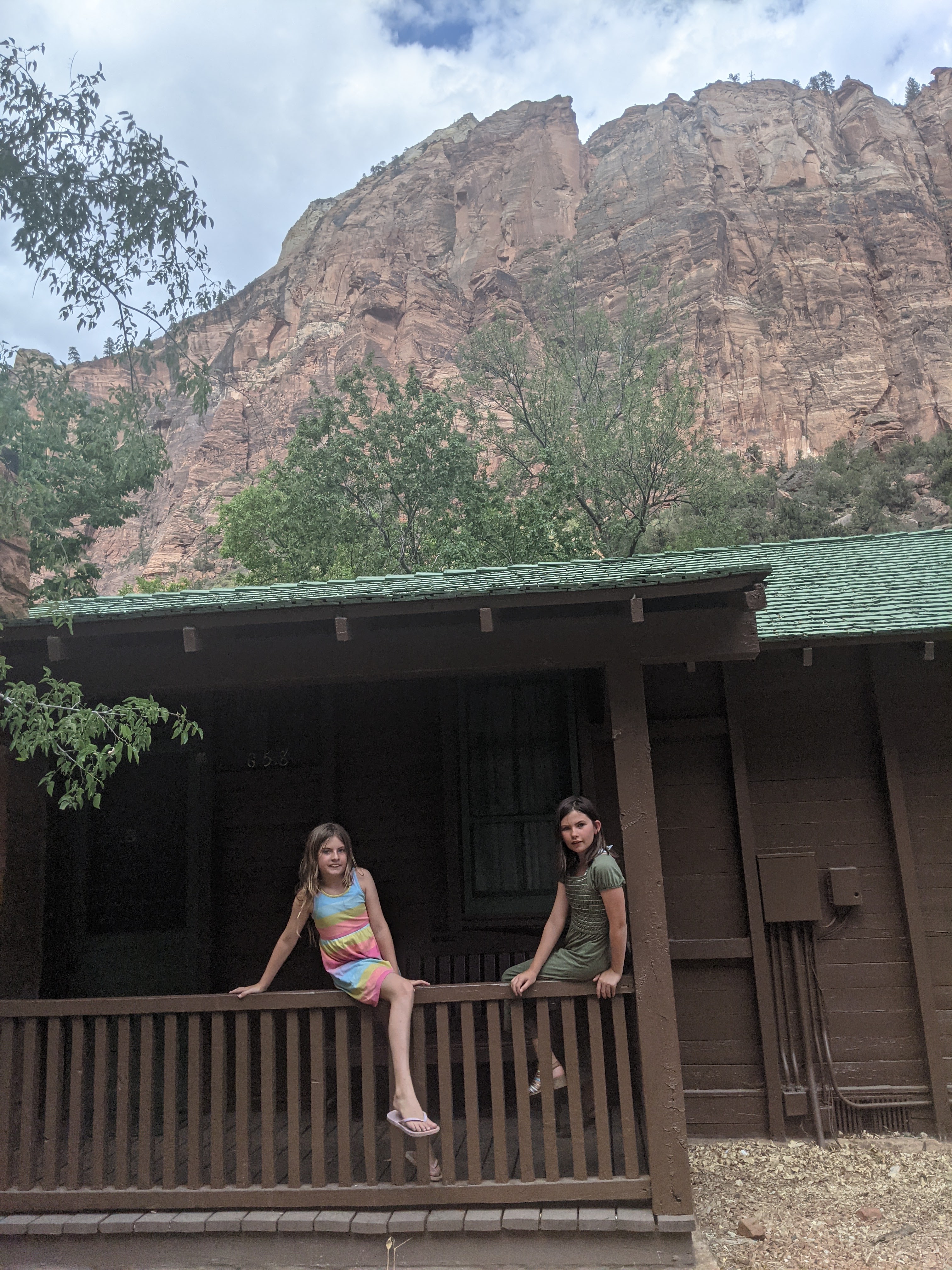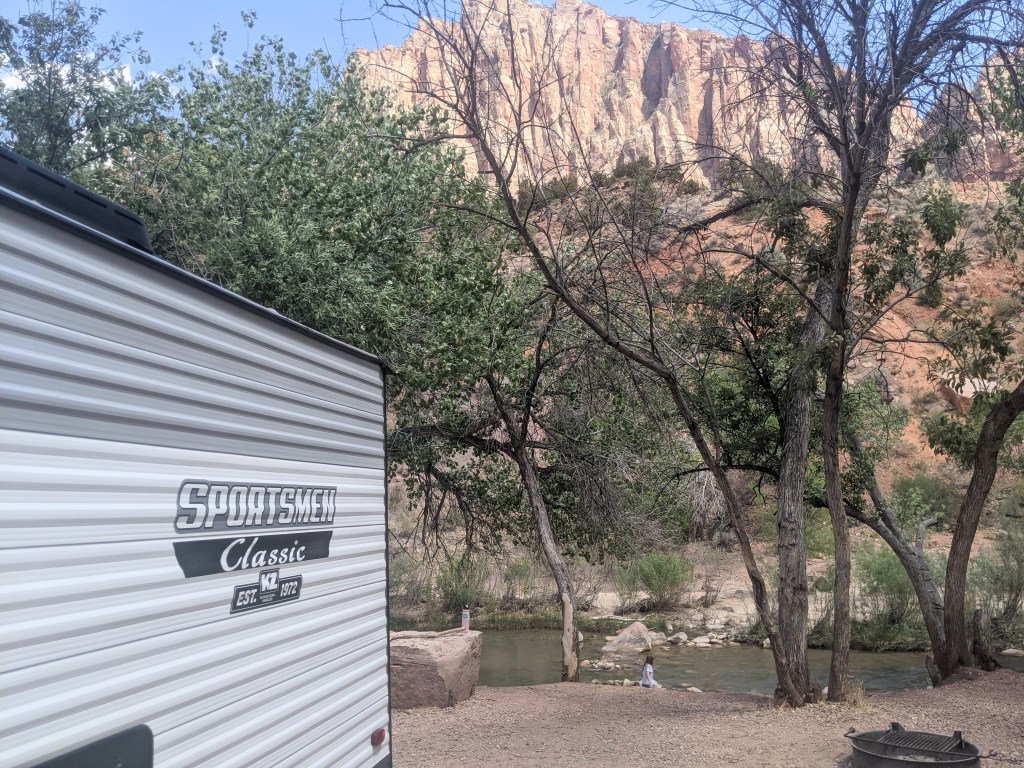 For the first part of our stay we stayed in Zion Canyon Campground, 1/2 mile from the entrance. We booked this way in advance as it books up quickly. Pros: Close to the park, beautiful site on the Virgin River, views all around. Cons: 6 minute shower tokens per person per day, not much shade, pool shared by hotel was small, flash flood (not in their control…more on that later).