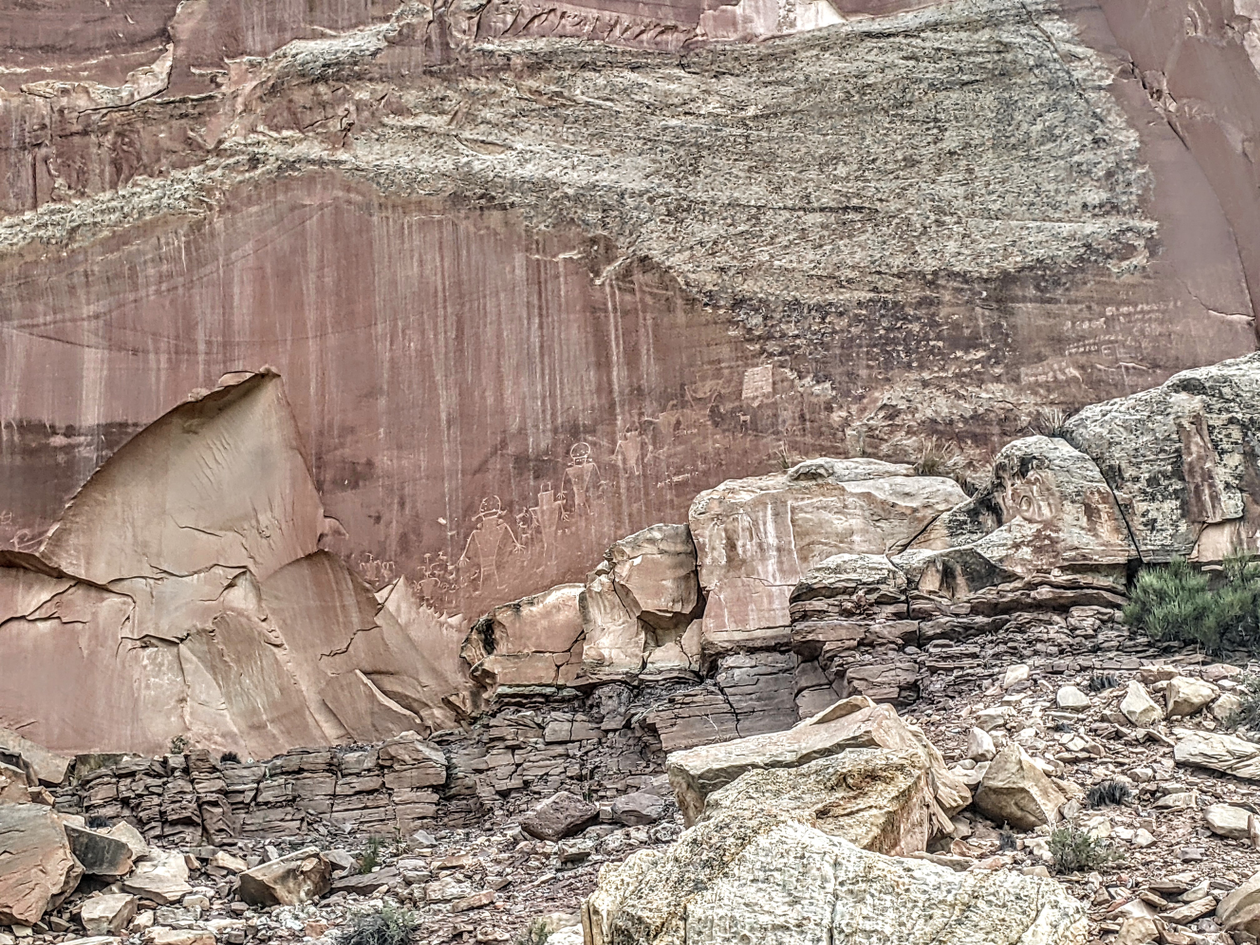After Panorama Point our plan was to hike the Hickman Bridge Trail. When we got to the parking lot we realized it was super crowded and there was no room to park our camper. So we doubled back and parked at the Petroglyphs. This was pretty cool to see and not a crowded parking area. It did add about .5 miles each way to our hike.