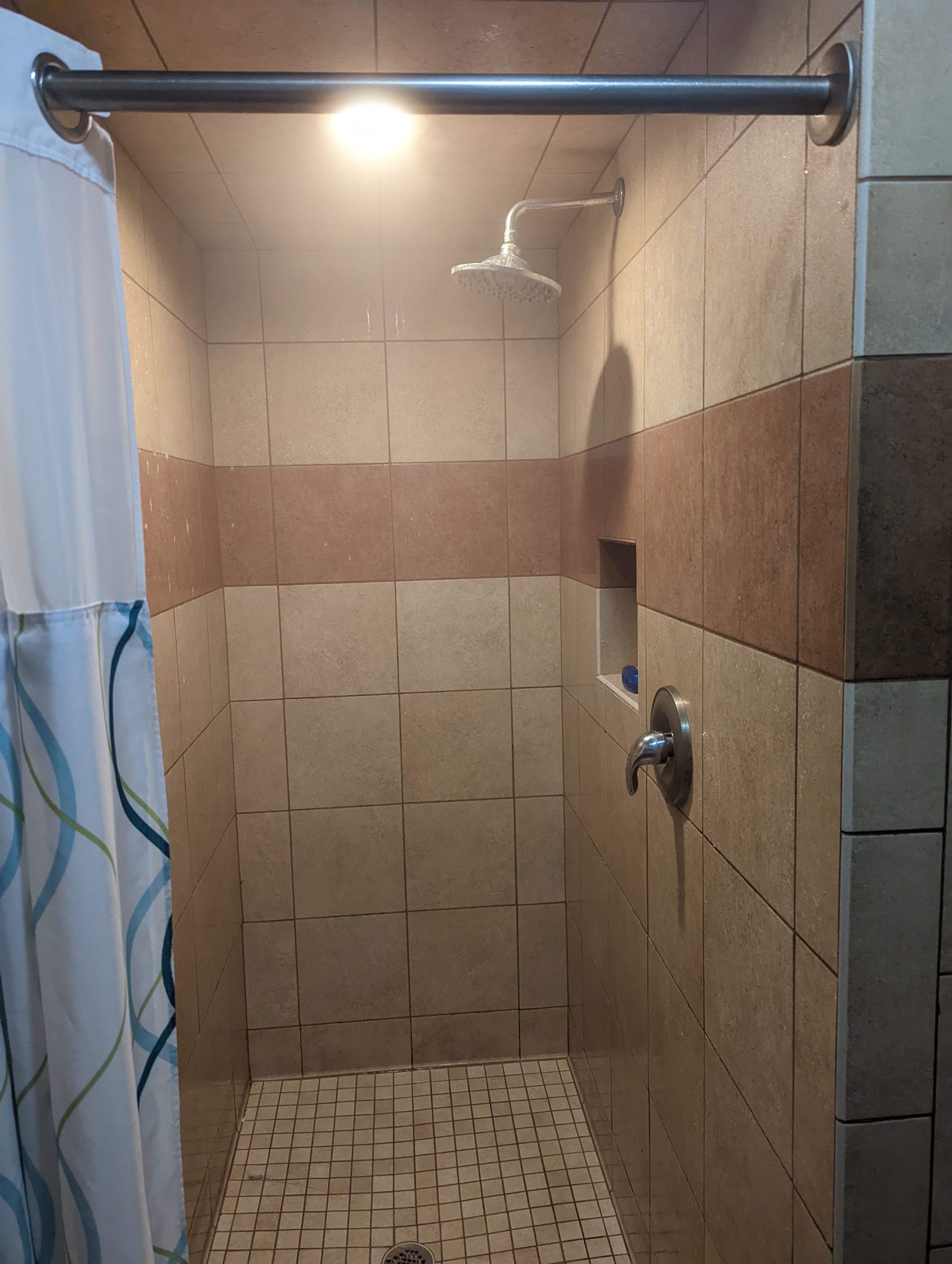 The showers were separate from the bathroom area and each shower had a separate door from the outside. I never experienced a wait for a shower even in the morning. They were nice and hot!