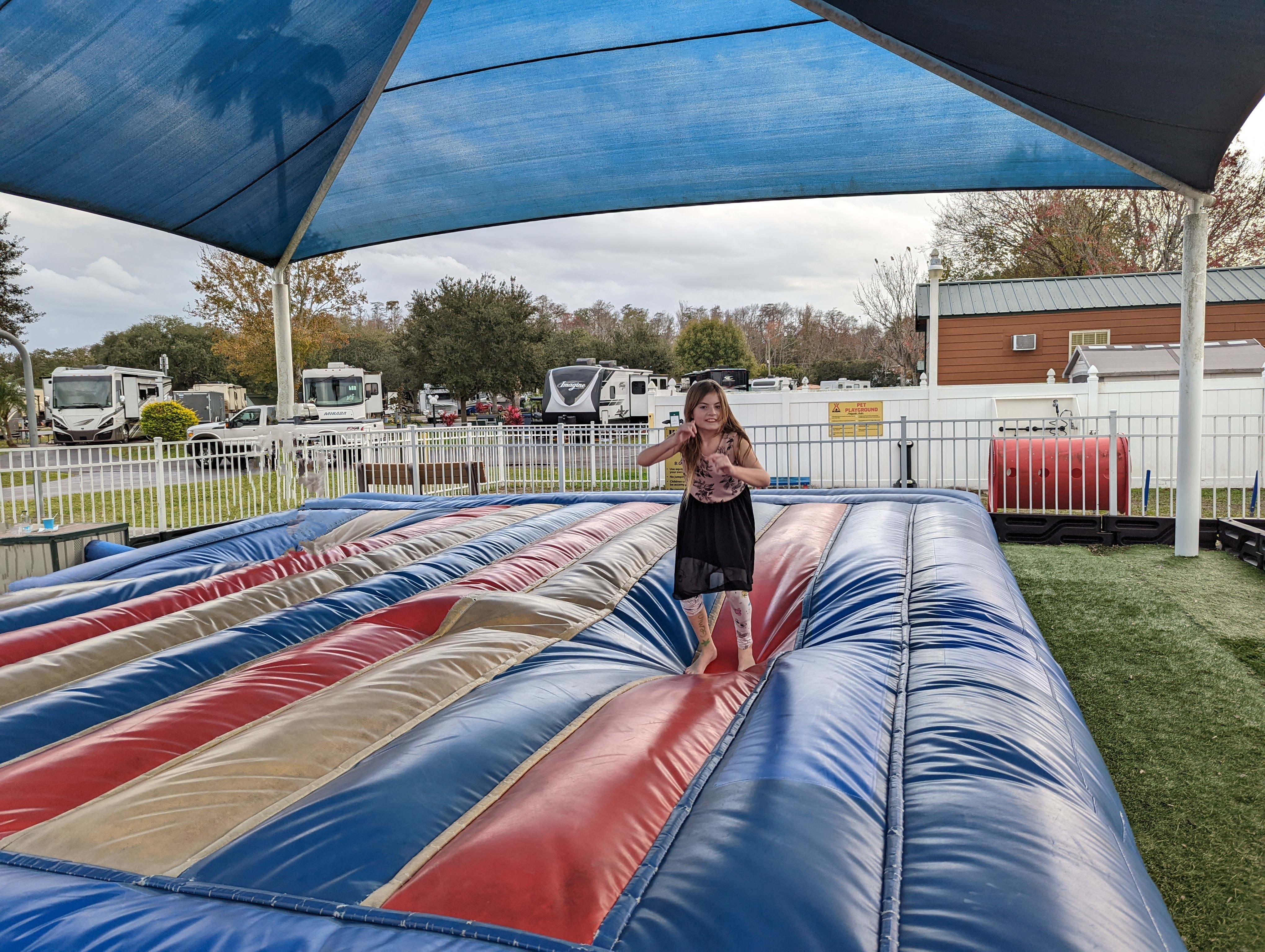 The kids enjoyed the jumping pillow and playground, and there is as small swing set as well. We didn’t bring our pups on this trip, but there is a small fenced in dog run area (you can see some of it behind the jumping pillow). The kids really only had free time in the mornings, but still managed to make a few friends.